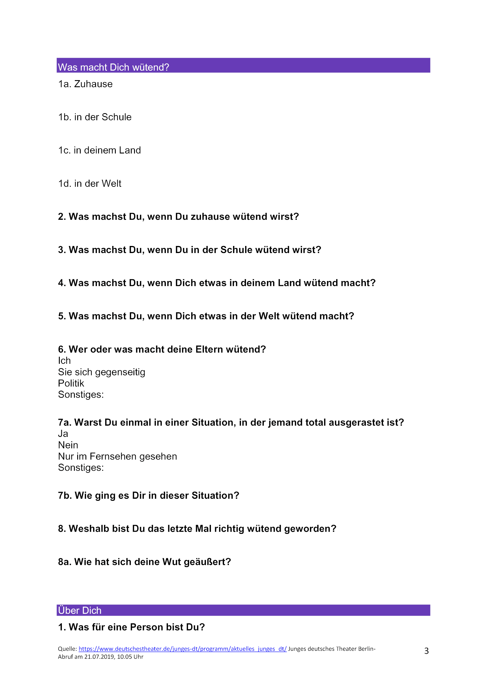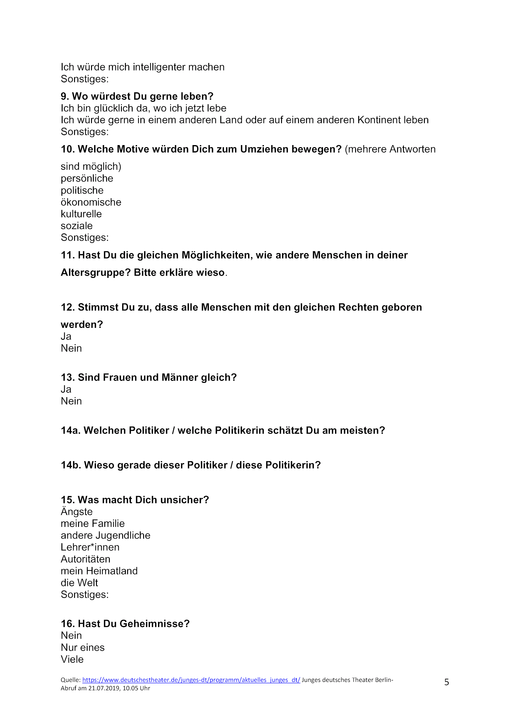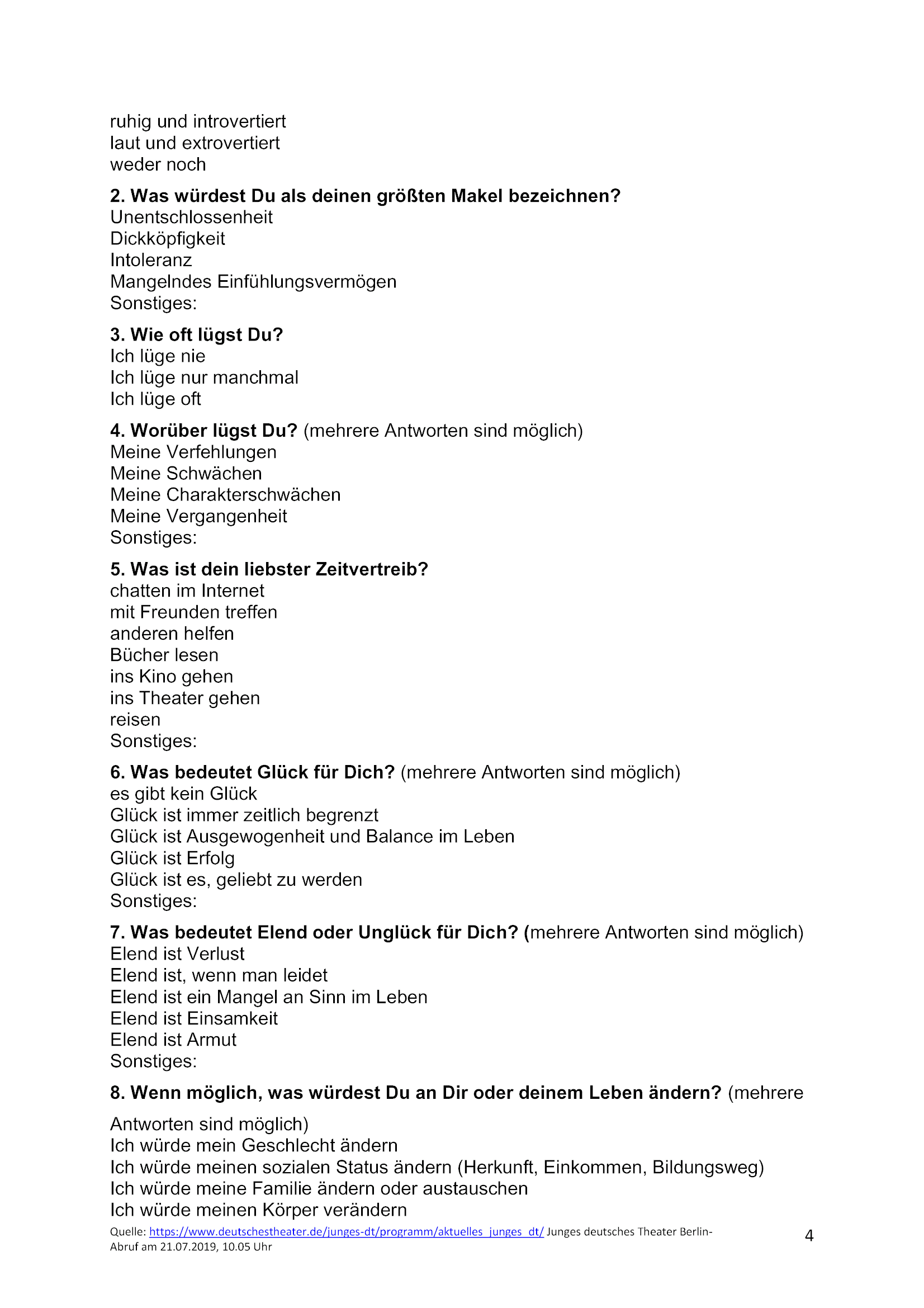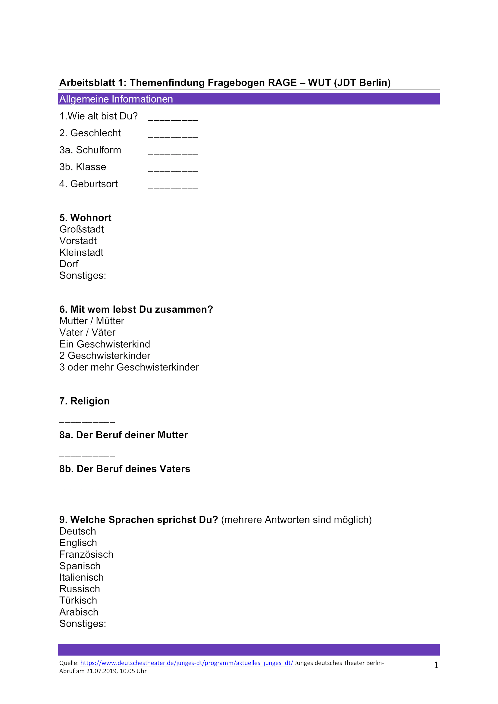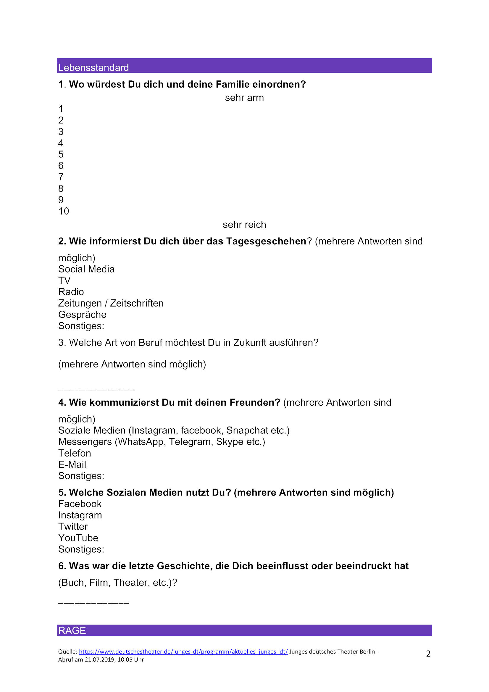 Füllt den Fragebogen aus und bringt ihn zur nächsten Theaterprobe mit.