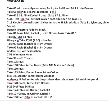 Dann wurden die einzelnen Sprechtexte der Figuren als Takes durchnummeriert und die Szenen mehrfach »durchgespielt« und durchgesprochen. Im Anschluss an diese gemeinsamen Proben nahmen die jungen Erwachsenen jeweils bei sich zu Hause die eigenen Takes mit dem Smartphone auf (manchmal nur 1 Sekunde lang), wobei alle als Vorgabe hatten, nahezu den gleichen Bildhintergrund und Bildausschnitt zu wählen. Diese so erstandenen Takes legten sie in einer gemeinsamen Dropbox. Dieses Material diente dann mir und der Filmemacherin Katharina Spuida-Jabbouti als Grundlage, um aus den am Ende knapp 750 Takes und einem selbst erstellten Storyboard wie bei einem Puzzle die einzelnen Szenen „zusammenzubauen“. Das so entstandene Videomaterial wurde dann in der nächsten Donnerstag-Probe wieder gemeinsam vom ganzen Kurs angeschaut und besprochen, das Feedback der Jugendlichen wurde für den weiteren „Feinschliff“ der Szenen genutzt.