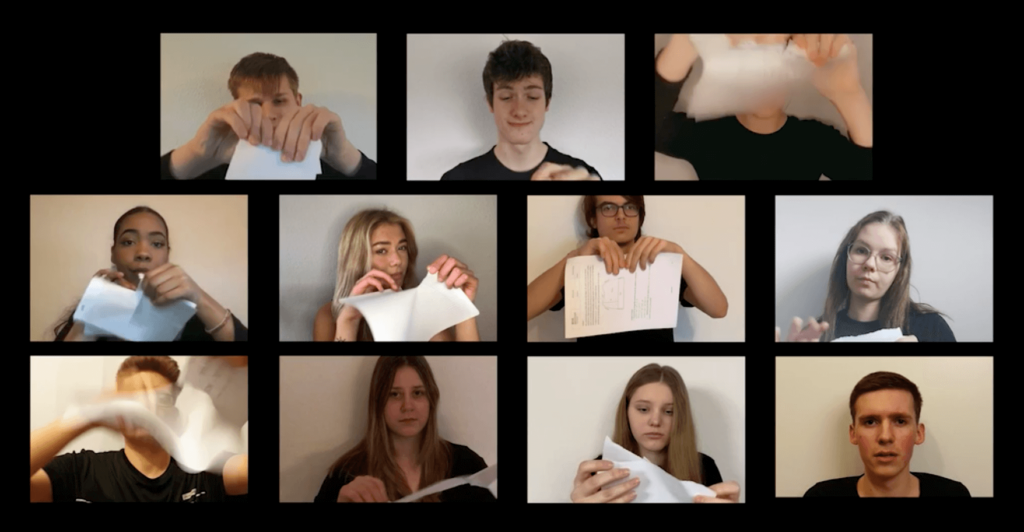 Bis zum zweiten Lockdown fanden dann „reguläre Proben“ statt, die Anfangs-Szenen wurden in Doppelbesetzung einstudiert, es gab erste Ideen für ein Bühnenbild. Im Zuge des zweiten Lockdowns war jedoch völlig unklar, inwieweit Präsenz-Unterricht weiterhin möglich bzw. ob eine analoge Première im Sommer 2021 realisierbar sein könnte. Ab Dezember war dann klar: Es findet kein Präsenzunterricht mehr statt. Im Online-Plenum wurde gemeinsam mit dem Kurs besprochen, ob ggf. auch eine digitale Variante denkbar sei. Da das Theaterstück bereits einen intimen Kammerspiel-Charakter aufweist und an eine Verhörsituation erinnert, entschieden wir uns dafür, das Stück fortan als vorproduzierte Film-Variante in der Kachel-Optik einer Online-Konferenz anzudenken. Nicht alle aus dem Kurs hatten Interesse an Online-Theater, konnten sich eine digitale theatrale Interaktion nicht vorstellen. Deshalb wurde der Kurs geteilt. Die eine Hälfte entschied sich für einen allgemeinen Online-Theater-Kurs, in dem sie gemeinsam mit der Lehrerin Iris Klostermann Theaterstücke online schauten oder in die Welt des Theaters eintauchten, um sich darüber auszutauschen. So wurden beispielsweise ausgewählte Podcast-Folgen vom Theaterpodcast des Deutschlandfunk Kultur besprochen.