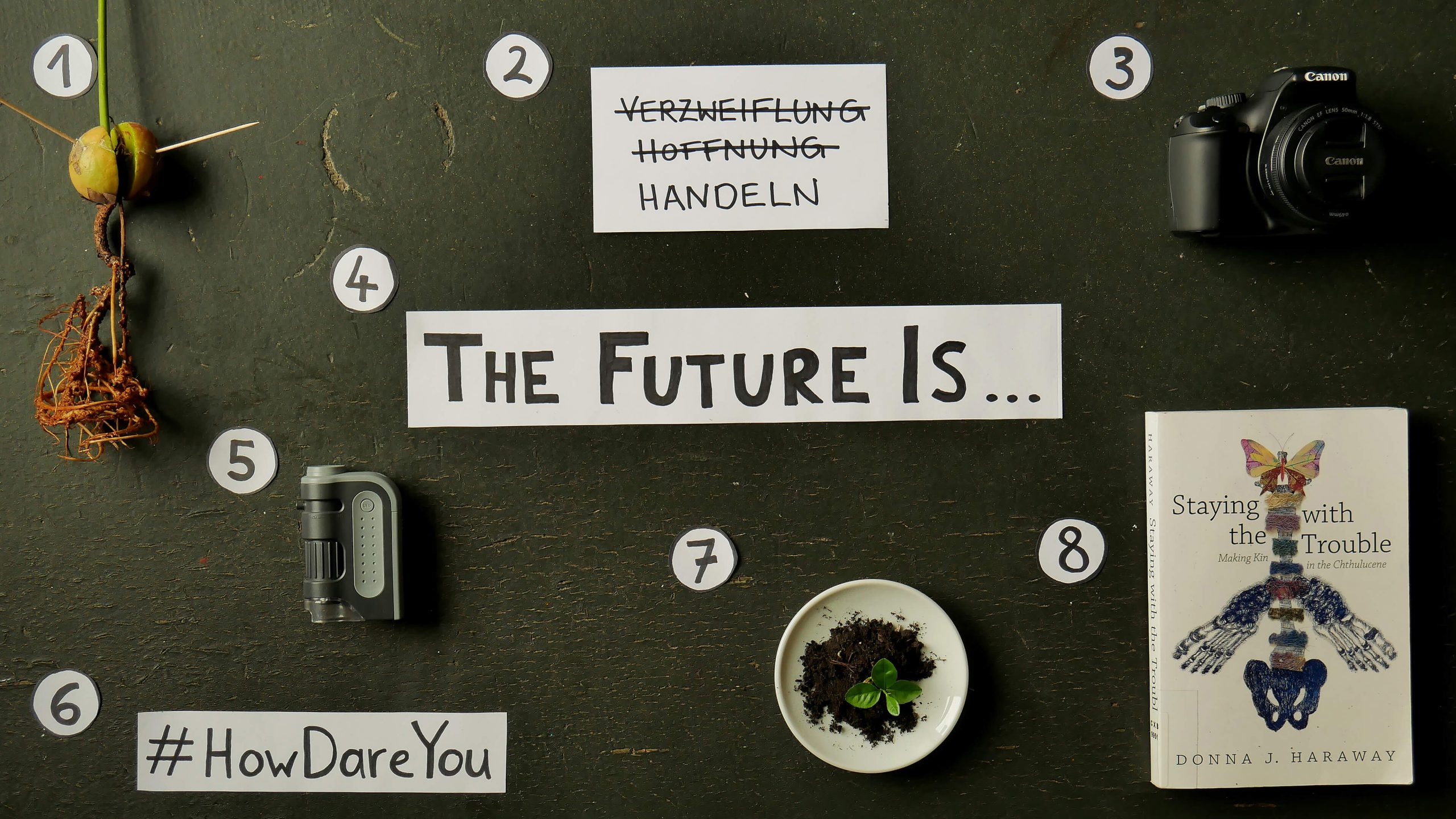 Die Philosophin und Biologin Donna J. Haraway gab uns mit ihrem Buch „Unruhig bleiben“ einen Denkraum, durch den dieses Handeln sowohl konzeptionell als auch praktisch möglich schien. Sie lud uns dazu ein die gewohnten Denk- und dann Handlungsmuster menschlichen Exzeptionalismus‘ zu verlassen, Verwandtschaften neu zu denken und uns verwandt-zu-machen mit nicht-menschlichen Akteur*innen. Ihr Blick darauf, wie wir, wir Menschen, wir als Spezies, Teil unterschiedlicher Gefüge sind, ist dabei der Ausgangspunkt. Was uns umgibt und durchdringt: Dinge, Menschen, Tiere, Pflanzen, Technologien, Pilze, Mikroorganismen, all das bildet Gefüge, die miteinander arbeiten, ineinandergreifen, einander ausnutzen, nutzen, heilen, nähren. Gefüge sind Ansammlungen und Kollaborationen von Leuten, Krittern und Apparaten. Gefüge werden sichtbar, wenn wir Verbindungslinien herstellen und erweitern.[1]